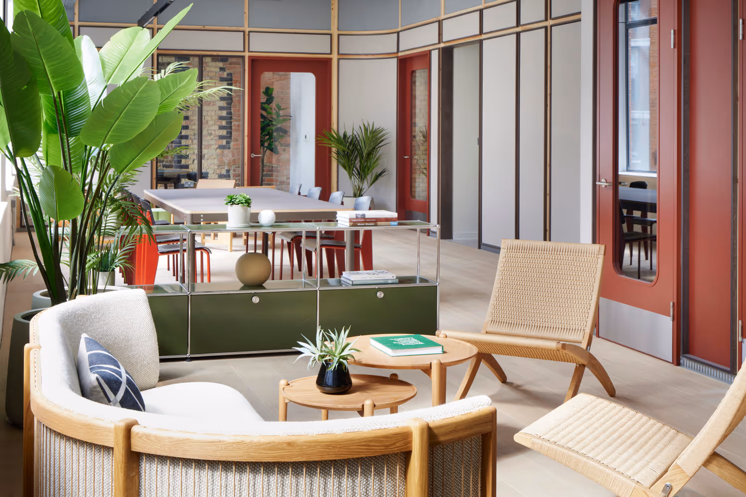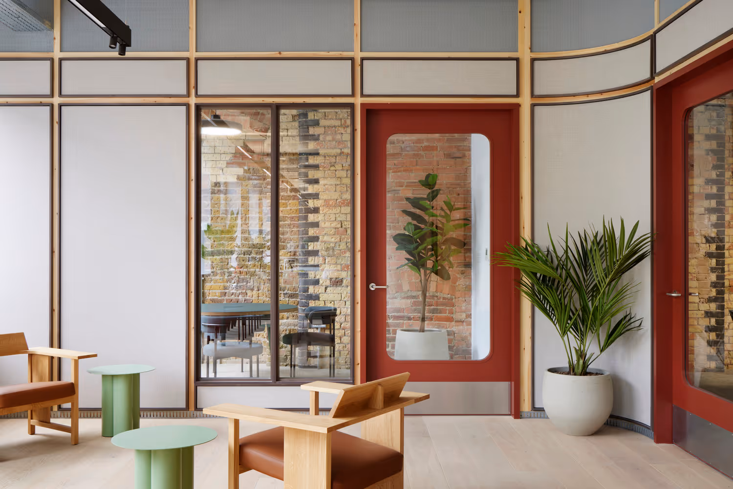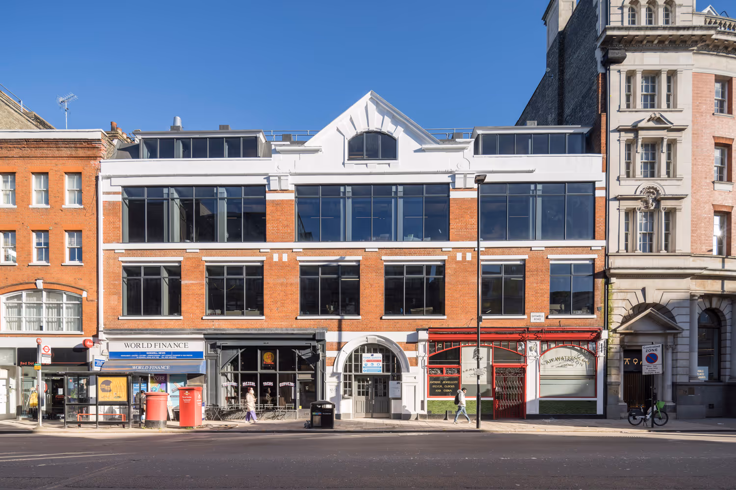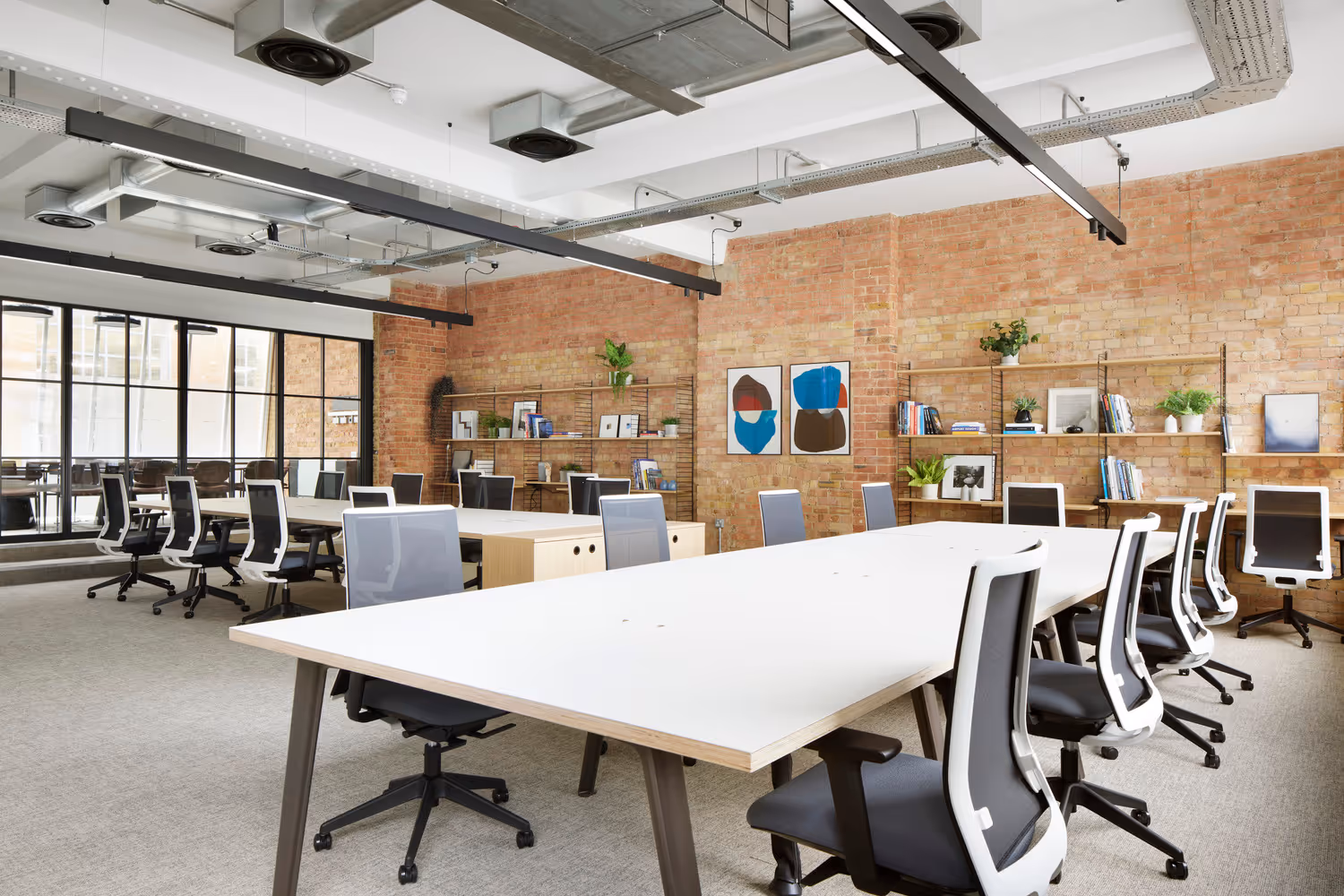 From 1,928 sq ft // 18 - 20 desksReimagined by award-winning architects AHMM, 80 Goswell Road offers prime workspace in Clerkenwells central and well-connected neighbourhood. The first, second and third floors offer private Furnished + Flexible office space, ready to occupy. Boasting spacious floor plates, excellent ceiling heights and exposed brick walls. The interior spaces are defined using AHMMs modular Jack system where fabric-covered panels create partitioned meeting rooms, phone booths and a kitchenette, and allow free-flowing work zones and breakout areas.