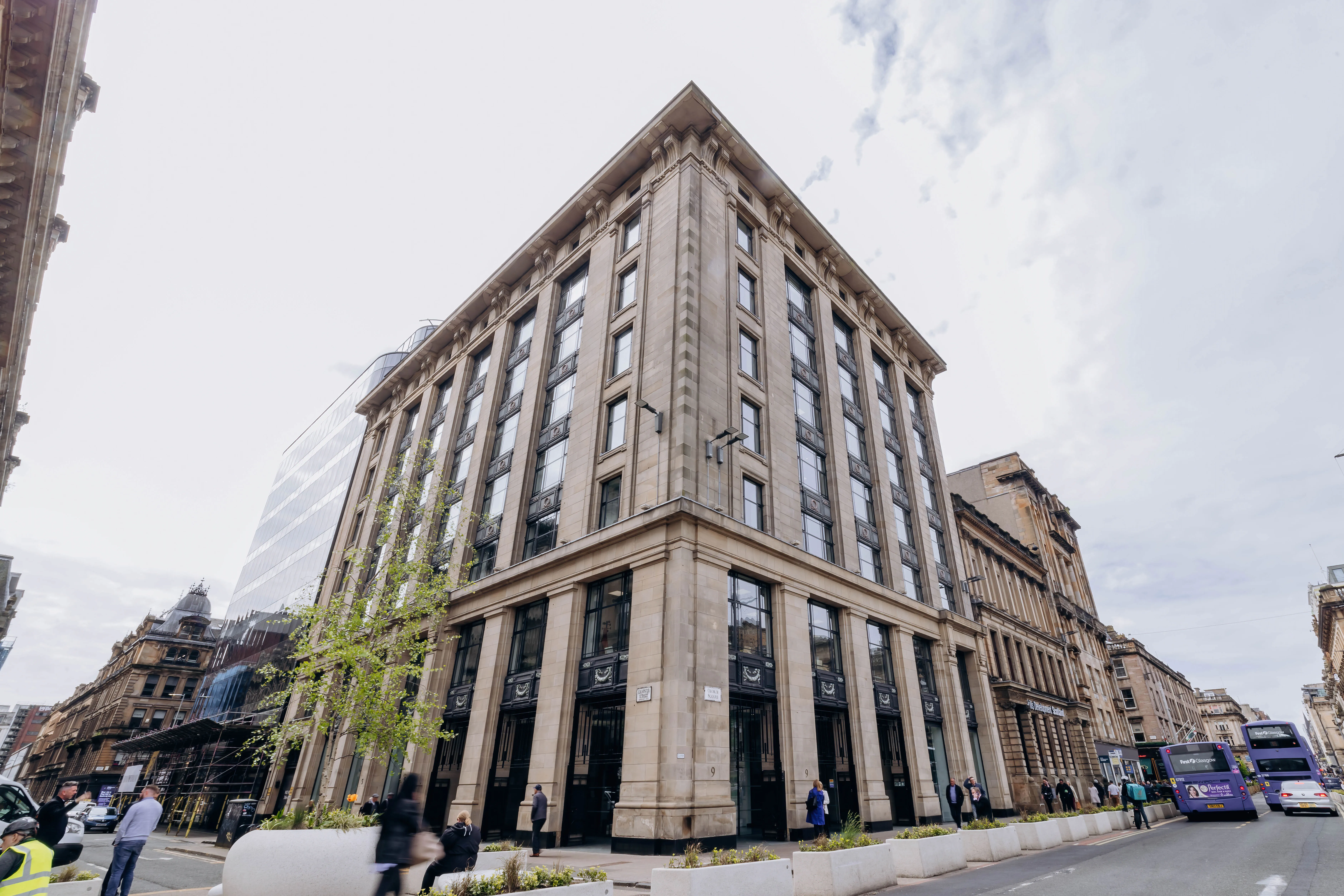 9 George Square is a beautiful prominent listed building on the corner of South Hanover Street and George Square. Its right at the centre of Glasgows main business district, offering three floors of spacious serviced offices that are the perfect choice for businesses wanting a more flexible way to work in central Glasgow.The serviced offices inside are all available fully-furnished, completely unbranded, and come inclusive of cleaning and maintenance to make life easier. There are a range of office sizes, suitable for every type of business from startups to large companies, with some featuring fantastic views over George Square.But its not just offices on offer. 9 George Square is also home to helpful amenities including bookable meeting rooms, relaxed breakout spaces, showers, and bicycle storage facilities. And, with on-site parking for drivers and both Glasgow Queen Street and Glasgow Central stations within five minutes walk, its easy to reach however you travel.