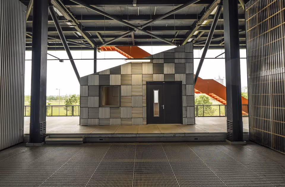 The Trampery on the Gantry is a joyous experiment in utilising open space to provide studios for local creative businesses. In collaboration with Here East and architects Hawkins\Brown, the massive steel structure at the back of the Broadcast Centre from the 2012 Olympics has been repurposed to create 21 freestanding studios with 10,000 square feet of space.